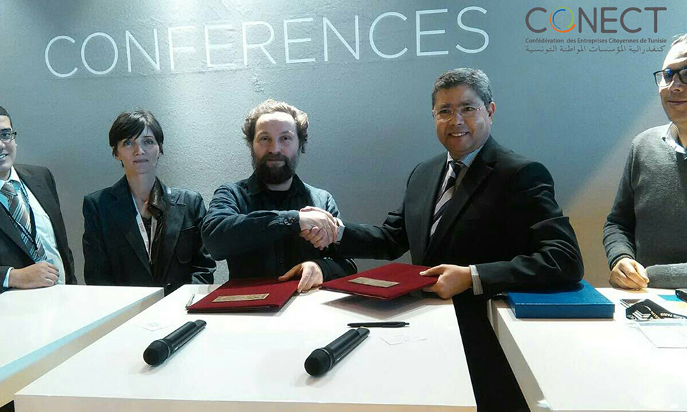 Samir Ben Abdallah, presidente del Conecht Gpch e Matthieu Gamet, presidente del Mmmm hanno firmato l’accordo di collaborazione durante Interfiliere a Parigi alla presenza di Anis Saadawi, addetto commerciale dell’Ambasciata della Tunisia in Francia.