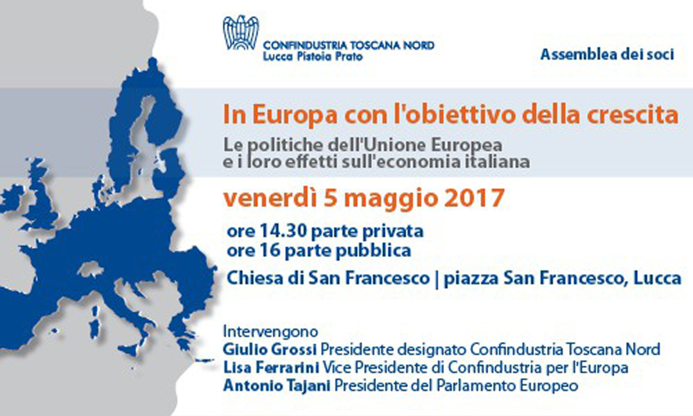 Nella parte pubblica dell’assemblea si parlerà di Europa con il presidente del Parlamento europeo Antonio Tajani e con la vice presidente di Confindustria per l’Europa Lisa Ferrarini. In Europa con l’obiettivo della crescita; le politiche dell’Unione Europea e i loro effetti sull’economia italiana sarà il tema affrontato a Lucca alle 16, nella Chiesa di San Francesco. Sarà proprio Giulio Grossi ad aprire i lavori, a seguire prenderà la parola Lisa Ferrarini, vice Presidente di Confindustria per l’Europa. Molto attesa la relazione di Antonio Tajani, presidente del Parlamento Europeo che chiuderà i lavori della giornata.